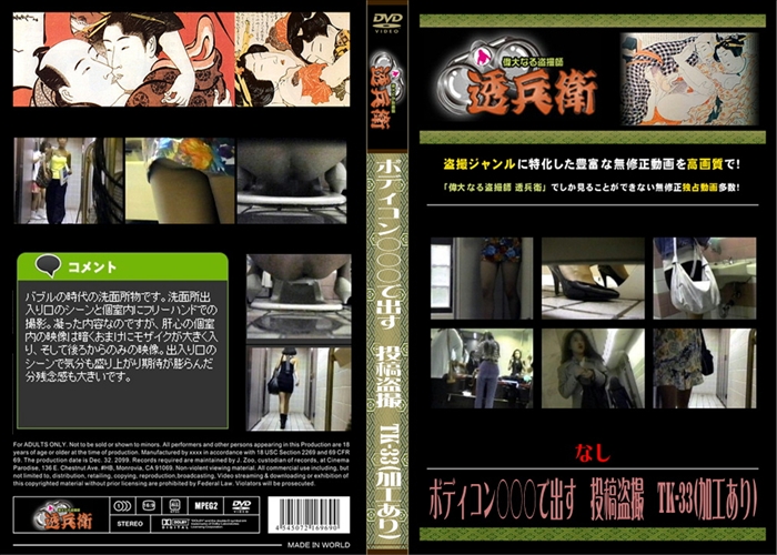 新作 バブルの時代の洗面所物です。洗面所出入り口のシーンと個室内にフリーハンドでの撮影。凝った内容なのですが、肝心の個室内の映像は暗くおまけにモザイクが大きく入り、そして後ろからのみの映像。出入り口のシーンで気分も盛り上がり期待が膨らんだ分残念感も大きいです。 和物 無修正 盗撮 透兵衛 メーカー: 透兵衛 女優: - 49 分