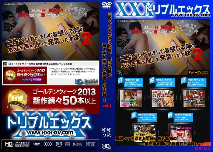 新作 一般的な家庭・・・学校が終わり妹が先に帰宅。夕飯までの繋ぎにバナナを食べて、二段ベット上の自分のベットへ・・・何気にムラムラした妹は股間に手を・・・枕の下に隠し持っていたローターでスッキリしてそのまま寝てしまうのだった・・・そこへ姉が彼氏を連れて帰宅。「まだ誰も帰ってきていないようね・・・」と玄関口で盛り上がり・・・ベットへと。ギシギシと軋む音と卑猥な声に目を覚ます妹・・・そっと下のベットを覗くと姉と彼氏が・・・妹は声と部屋中に立ち込める卑猥な匂いでまたオナニーを始めてしまうのだった・・・上に誰か居るのに気が付いた彼氏は・・・vol.02へ続く 無修正 和物 素人 女優 メーカー:トリプルエックス 女優:ゆめ ゆう 42分
