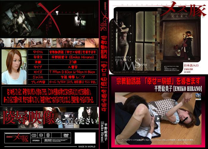 新作 洗い物をしていると、来客があり男2人が訪ねてきた。「この本を読めば幸せになれますよ」といかにも胡散臭い。断っているにも関わらず、男たちは侵入していく。「快感が幸せにつながるのです」とむしろ、苦痛を強いられるのであった。 無修正 和物 素人 女優 メーカー:メス豚 女優:平野絵美子 25分